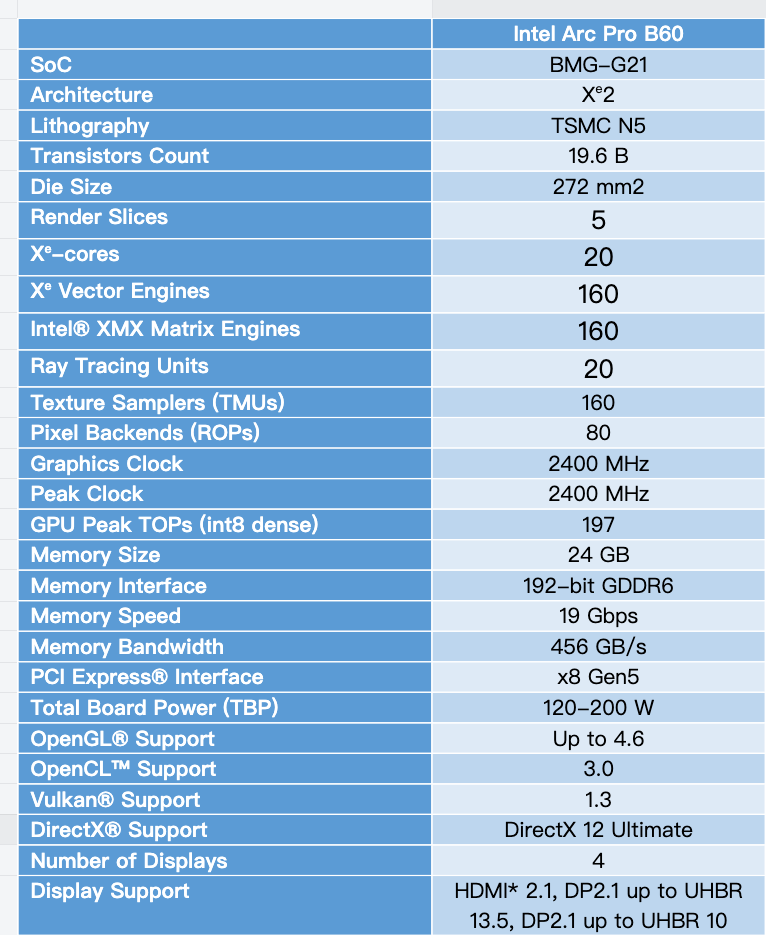 以上是Arc Pro B60的主要参数,为了便于大家对比和理解,这里简单介绍一下主要的信息: