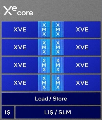 上图中的Xe-core的概念对应的是英伟达的SM,就是基本的计算单元。此外,Xe Vector Engines(XVE)向量引擎的概念对应英伟达的Cuda核心,XMX Matrix Engines对应英伟达的Tensor核心,Ray Tracing Units对应英伟达的RT核心。