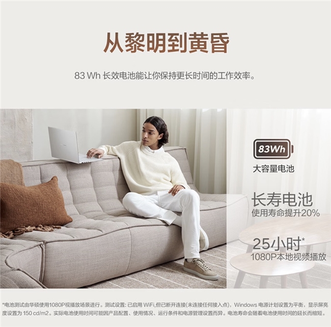 续航方面则是83Wh大容量电池,官方界面显示可带来至高25小时的持久续航,满足全天外出办公的电量需求,彻底缓解续航焦虑。