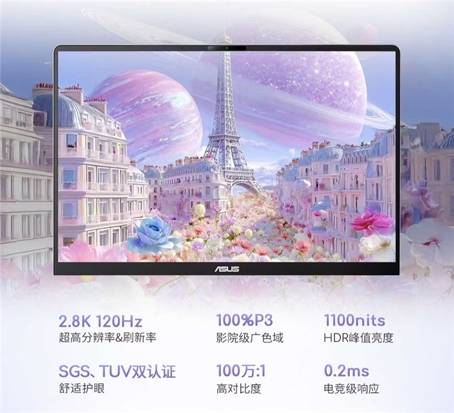 屏幕为14英寸2.8K 120Hz OLED屏,拥有1100nit峰值亮度,平时遇到靠窗的座位也能够清晰看清屏幕内容;另外机型出厂时逐台校色实现ΔE<1高色准,带来出色的视觉体验。