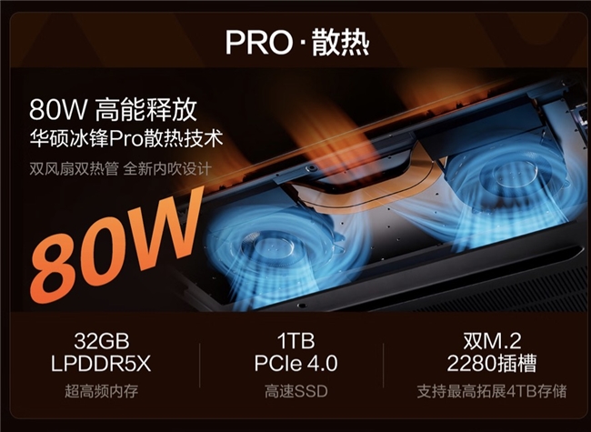 性能释放上,该机也是搭载最新AMD锐龙AI 9 H 465处理器,配合华硕冰锋Pro散热技术,双风扇双热管设计,其中75mm游戏本级大风扇搭配D10超粗热管,再加上内吹式散热设计,可大幅提升散热效率,实现高达80W的性能释放,意味着不仅日常学习办公毫无压力,即便是3A游戏,只要不过分追求高画质,也能保持流畅的游戏体验,一台设备即可满足全场景需求。