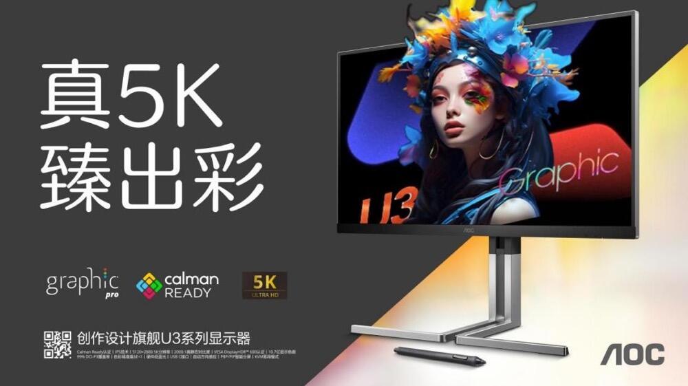 AOC始终以技术创新为核心驱动力,在商用显示器领域聚焦创作设计、商务办公等核心商用场景,在高清显示、色彩精准度、便捷交互等关键技术领域持续突破,为品牌领导力筑牢根基。在高清显示技术方面,旗下创作设计旗舰产品K27U3D搭载5120×2880真5K分辨率,具备广色域、灵活拓展等性能,配合218PPI超高像素密度,实现纤毫毕现的画面呈现,让设计创作者精准把控作品细节;2000:1高静态对比度使暗场亮度较传统IPS面板降低约50%,能呈现更丰富的暗场层次与色彩细节,为设计制图、影视剪辑、内容创作等专业场景提供精准展现。