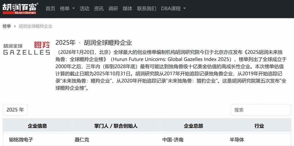 2026年1月,胡润研究院发布《2025胡润未来独角兽:全球瞪羚企业榜》,视频处理芯片(VPU)定义者、全球领先视频处理解决方案创新者——镕铭微电子(济南)有限公司(以下简称“镕铭微电子”)继2024年入选该榜单后,再度获评。值得关注的是,胡润瞪羚企业榜单并非依赖企业自主申报,而是基于投资机构动向、行业数据与市场研究独立形成,这充分表明公司在成长性、创新力与赛道前景方面,持续获得专业投资界的高度关注与认可。