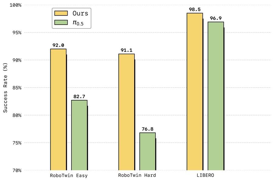 在仿真评测中,LingBot-VA在高难度双臂协同操作基准 RoboTwin 2.0 上首次将成功率提升至超过 90%,在长时序终身学习基准 LIBERO 上达到 98.5% 平均成功率,均刷新了行业纪录。