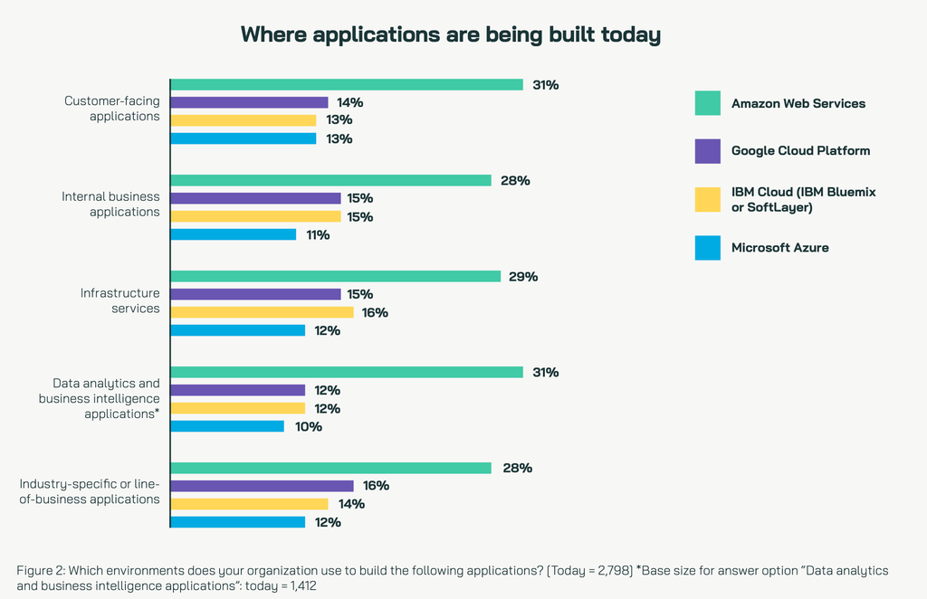 报告还统计了用户偏好的云厂商,不出所料是亚马逊云科技、谷歌云、IBM云以及微软Azure云,在面向客户的应用、内部业务应用以及特定业务线等应用方面,使用亚马逊云科技的企业机构比例大幅领先于其他云厂商。