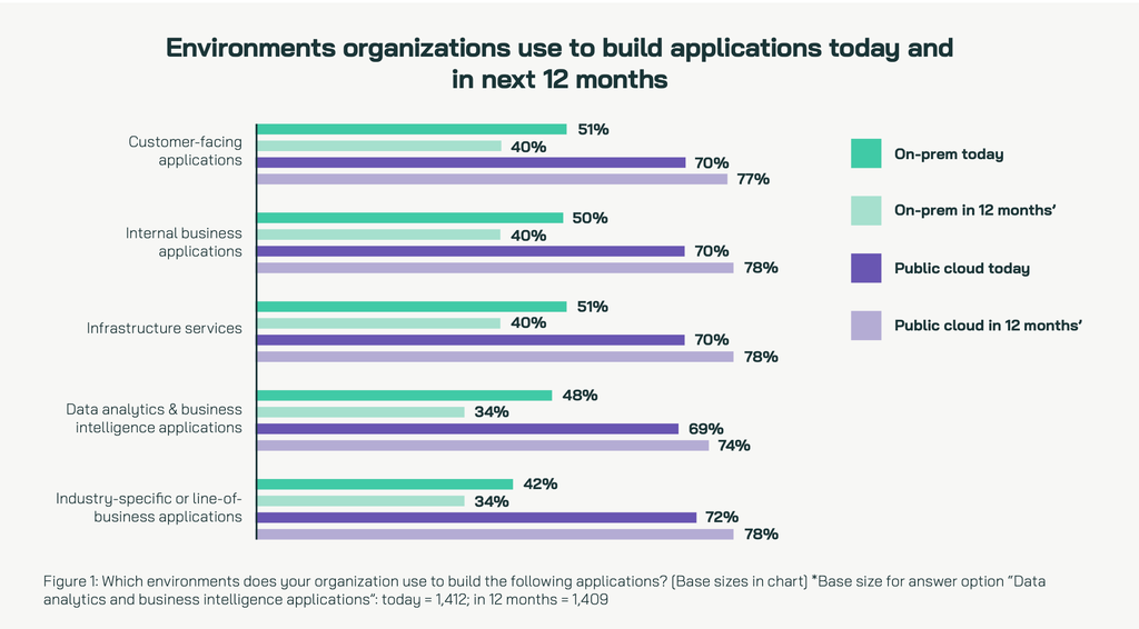 调研数据显示,目前企业平均有59%的应用在云端运行,预计明年将提升到75%。与此同时,应用开发也在向云端迁移,数据显示,目前几乎所有受访者 (99%) 都在公有云中开发应用,继续在本地开发的比例还会下降。