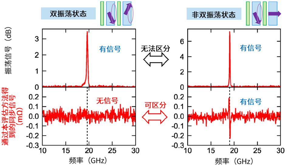 该方法着眼于STO振荡与评估用天线所照射微波之间的同步现象。同步现象的有无因STO振荡状态而异,特别是在双振荡型STO所追求的双振荡状态下,该同步现象不会出现。即使在传统测量中振荡信号无明显差异的情况下,该方法也能明确区分双振荡状态与非双振荡状态,从而阐明振荡状态(图2)。根据STO的振荡状态,可能会出现多个振荡信号,但由于可以在频率层面进行测量,因此可以确定出共振型微波辅助磁记录(MAS-MAMR)最佳振荡状态的真实频率。