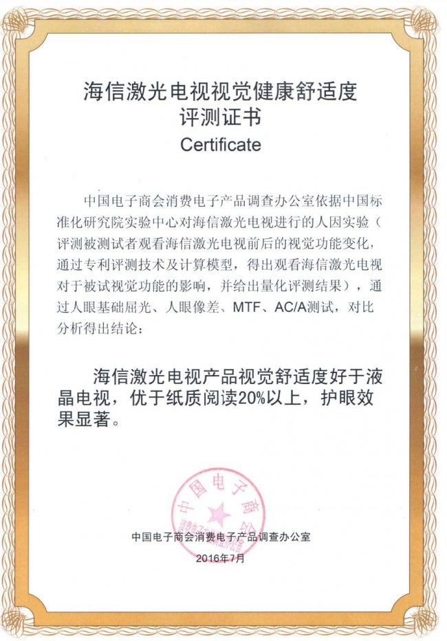 而真正的护眼,应从光源源头规避有害蓝光。海信激光电视星光S1纯享版是行业唯一通过德国莱茵“0有害蓝光”认证的电视,实现0有害蓝光、0屏幕辐射、0眩光、0反光、0频闪五大护眼标准。其采用455nm以上纯净激光光源,完全避开415–455nm高危短波蓝光;配合漫反射成像原理,光线通过屏幕反射至人眼,与人眼观察自然万物的原理一致。中国电子商会消费电子产品调查办公室依据中国标准化研究院实验中心对海信激光电视进行的人因实验,通过人眼基础屈光、人眼像差、MTF、AC/A等多项测试,对比分析得出结论:海信激光电视产品视觉舒适度好于液晶电视,优于纸质阅读20%,护眼效果显著,尤其适合有孩子的家庭。