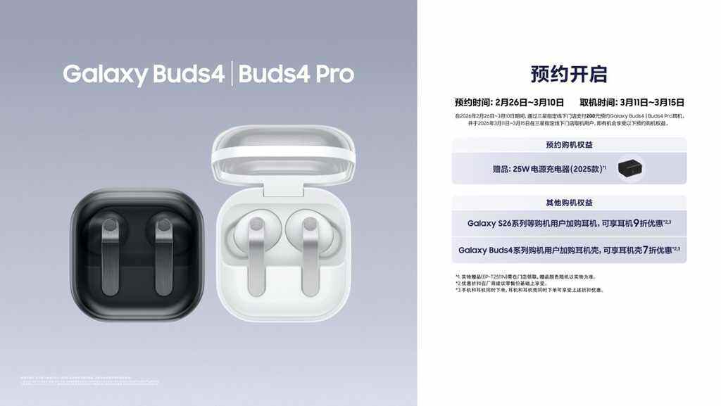 综合来看,三星Galaxy Buds4系列在音质、降噪、设计与Galaxy生态的协同和交互方面都有着较为出色的实际表现。对于重视音乐细节表现的用户,在扬声器结构与高解析音频支持上的提升,使其在声场层次与解析度方面更具优势;对于经常通勤或需要沉浸环境的用户,自适应主动降噪能力能够明显优化使用体验;而对于三星Galaxy生态用户来说,从开盖即连到快捷菜单调节,整体协同效率进一步提升,日常使用更加顺畅。现如今三星Galaxy Buds4与三星Galaxy Buds4 Pro产品正在火热预约中,现在参与活动入手非常合适!