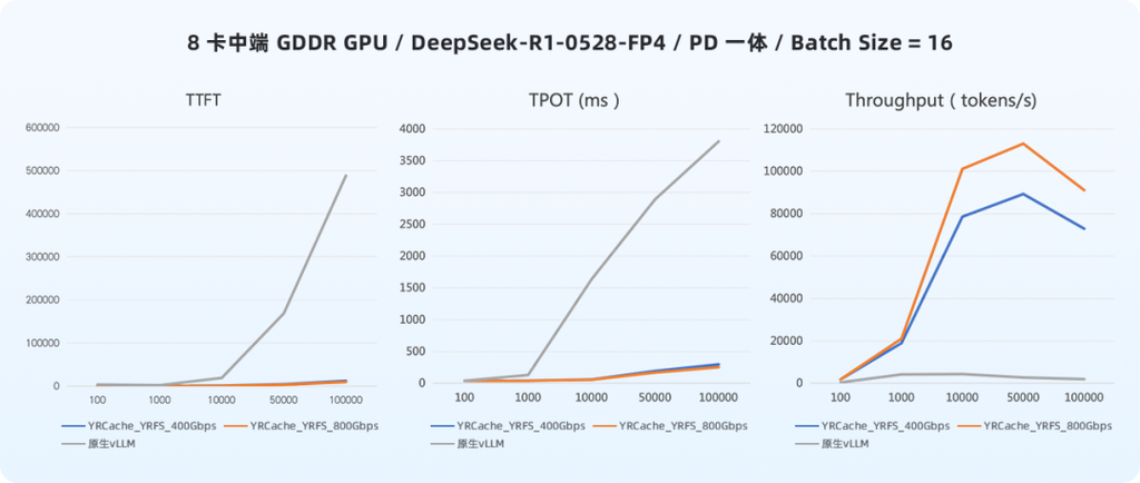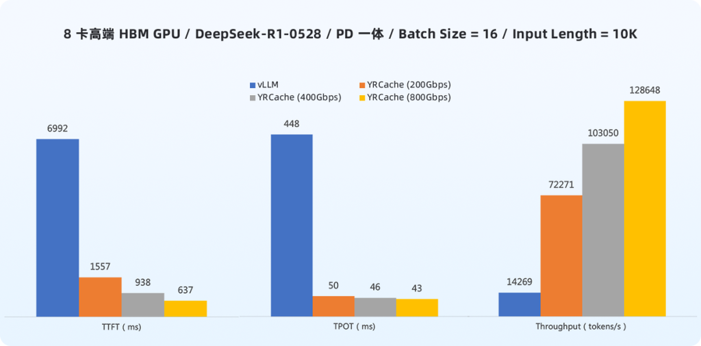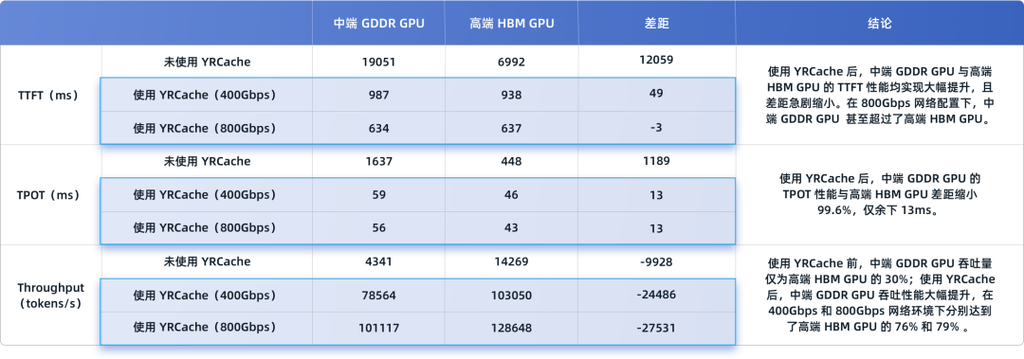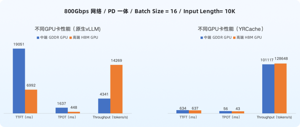 从上图中的数据可以看到,在未使用 YRCache 时,中端 GDDR GPU 相较于高端 HBM GPU 存在明显的性能差距:
