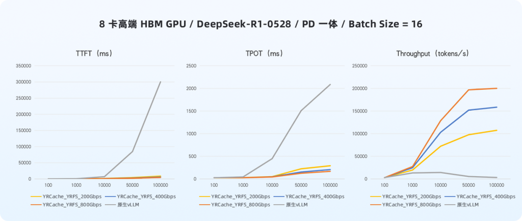 本次测试主要围绕 PD(Prefill-Decode)一体化推理场景,基于 DeepSeek-R1 等主流大模型,对比原生 vLLM 框架与集成 YRCache 后的系统,在不同网络带宽配置(200Gbps / 400Gbps / 800Gbps)下的性能表现。