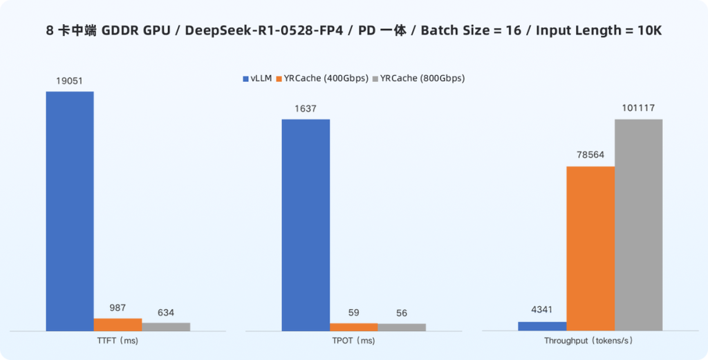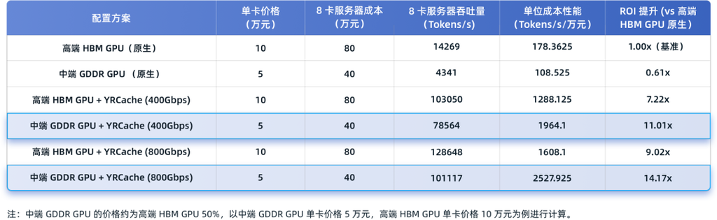 - YRCache 加持下,中端 GDDR GPU 各项推理性能接近高端 HBM GPU,ROI 提升 14 倍