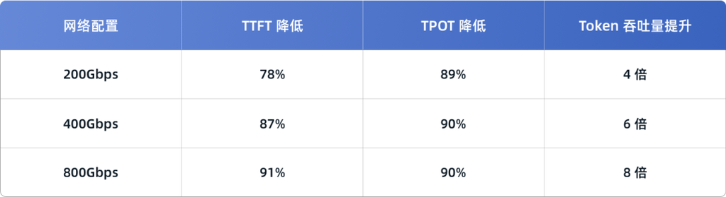 - 在 800Gbps 网络环境下,TTFT 降低 97%,TPOT 降低 97%,token 吞吐量提升 22 倍。