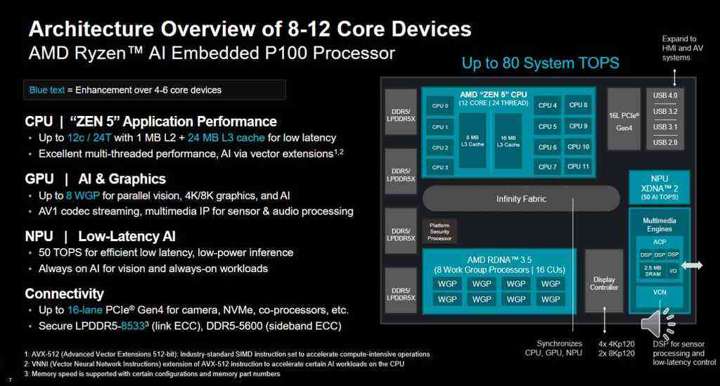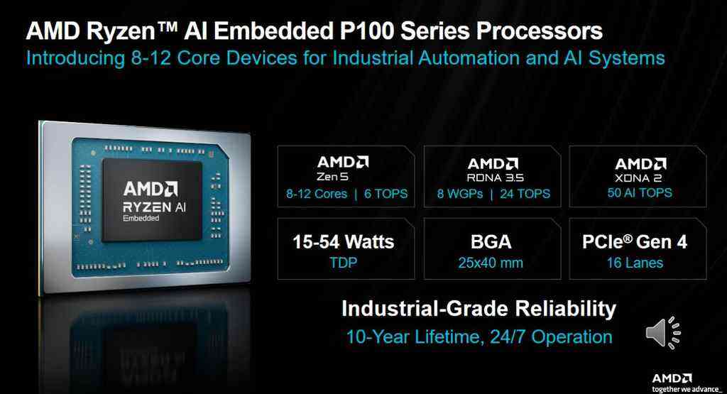 作为此次新品的核心,AMD 锐龙AI嵌入式P100系列处理器主打工业自动化、汽车数字座舱等主流边缘场景,基于4纳米工艺打造,采用单片异构架构。
