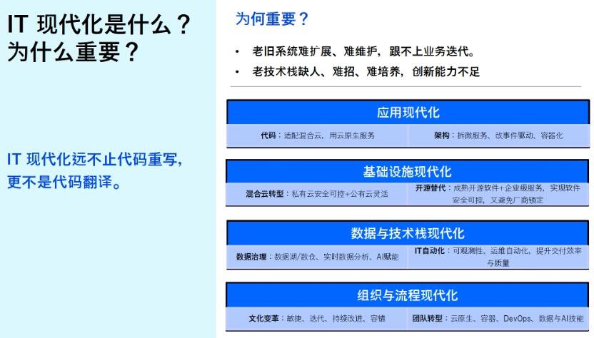 对此,IBM大中华区董事长、总经理陈旭东表示,代码翻译不等于IT现代化。真正的IT现代化包括硬件更新、软件迁移、流程重组、组织变革等一系列工作,绝非翻译代码这么简单。客户们也清楚这点,所以并没有恐慌,IBM股价最近也回升了。
