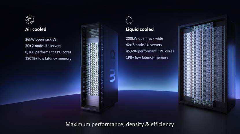 在能效方面,支持高密度1U服务器机箱的风冷部署方案,单机架可支持多达8160个计算核心;同时也支持液冷系统,单机架可实现超过45000个核心的部署规模。风冷与液冷双适配的设计,兼顾了中小规模数据中心的低成本部署与超大规模集群的高密度算力需求,灵活适配不同客户的基础设施条件。