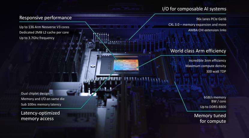 在性能表现方面,单颗CPU集成多达136个Arm Neoverse V3核心,在单核、系统级芯片(SoC)、刀片式服务器及机架各层级均实现行业领先的性能表现,同时提供每核心6GB/s内存带宽,时延低于100ns。超大核心规模与高内存带宽、低时延的组合,完美匹配生成式AI推理的高并发、低延迟需求,彻底解决传统CPU在AI推理场景下核心不足、带宽瓶颈、时延过高的问题。