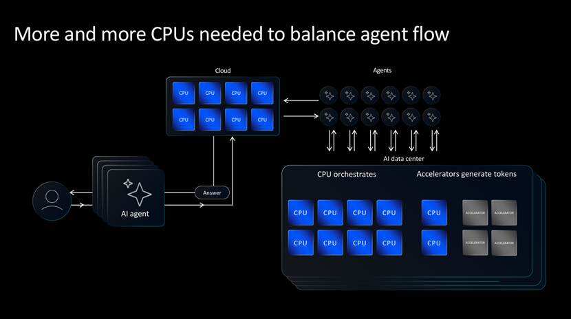 一方面是在AI加速方面,CPU相比专门的加速器在表现方面并不尽如人意。不过随着AI从模型训练向在线推理转变,整个AI系统生成的词元(token)数量正在飞速增长,亟需更多CPU来承载推理、协同调度与数据迁移等任务。生成式AI的普及让推理场景呈现指数级扩张,海量token处理、跨芯片调度、数据流转与算力分配等工作,都高度依赖CPU的稳定支撑,CPU正从AI系统的“辅助角色”转变为“刚需核心”。