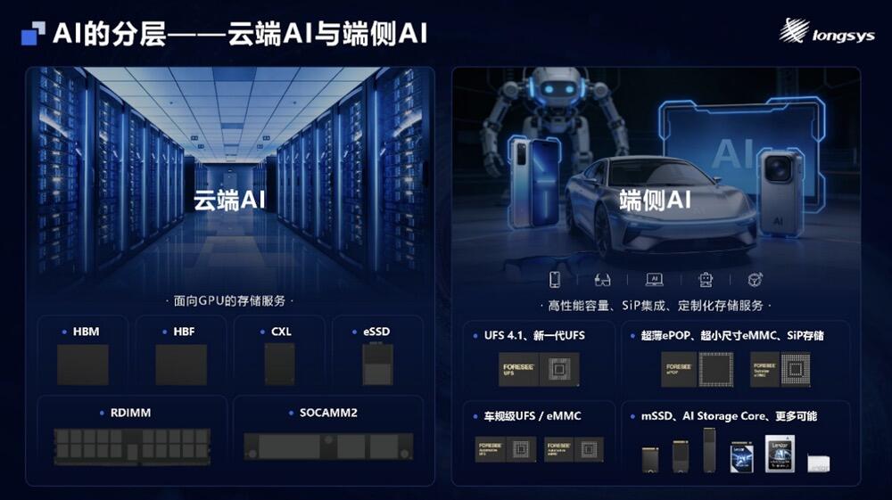 演讲开篇从AI产业分层发展格局出发,清晰划分云端与端侧AI的存储服务核心差异:云端AI聚焦面向GPU的专业化存储服务,而端侧AI则围绕高性能容量、SiP系统级集成封装、定制化服务三大核心需求展开,其对存储的要求与过往标准存储生态存在本质区别。正如消费级GPU与AI专用GPU分属截然不同的体系,前者依托通用芯片生态,后者面向完整AI系统产品打造,端侧AI同样需要深度集成的定制化存储方案,而非通用标准存储产品。基于这一精准定位,江波龙聚焦端侧AI集成存储解决方案,精准匹配AI手机、AI辅助驾驶、AI穿戴、AI PC、具身机器人等多元场景,为端侧AI存储创新锚定清晰的场景导向,与云端AI存储形成优势互补。