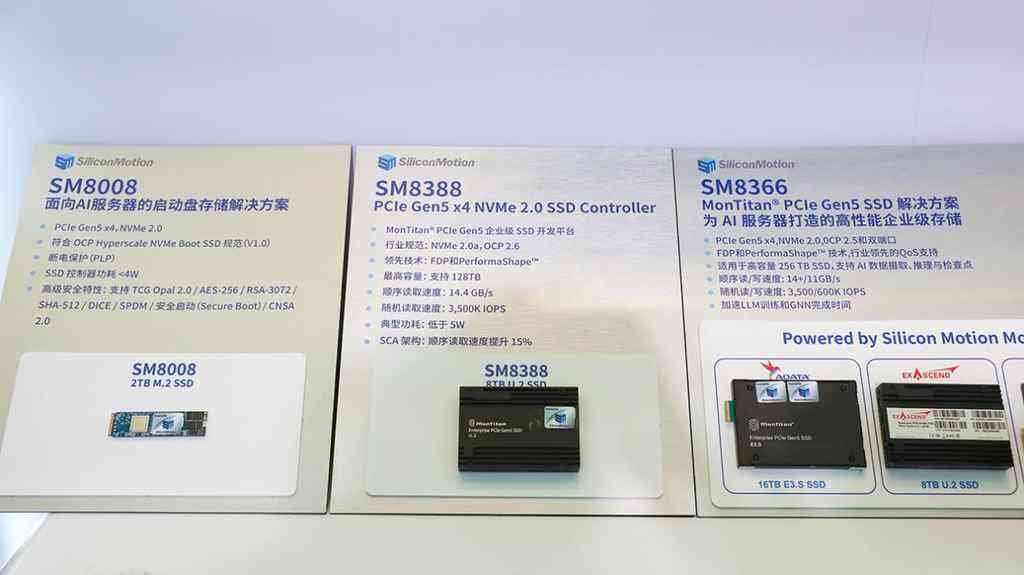 除了SM8388主控芯片亮相外,慧荣科技展台还展示了搭载SM8008主控芯片的M.2 1TB企业级启动盘SSD和搭载SM8366主控芯片的企业级固态硬盘。
