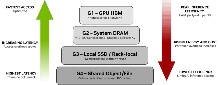 比如,去年还有很多人认为Gen 6 SSD没有必要用16通道,但现在来看还是需要,否则性能会跟不上需求。英伟达的存储架构图中规划了一个叫G3的存储层,这里需要SSD具备微秒级的延迟,需要高性能SSD来存储热的KV Cache数据。