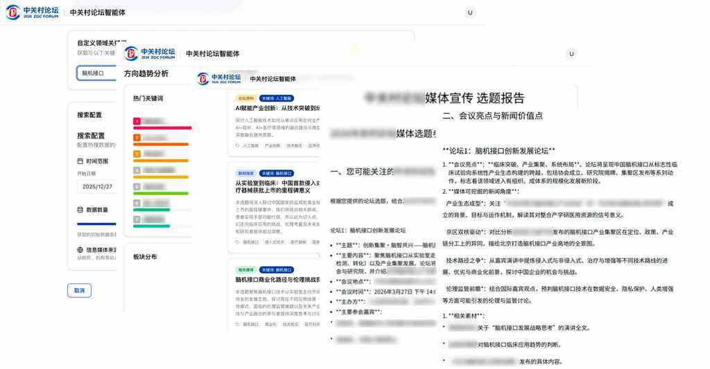 二是智能选题应用。针对论坛高规格会议密集、策划统筹工作量大的核心痛点,整合外部前沿方向、舆情热点动态与内部会议纪要、嘉宾资源等核心信息,精准捕捉行业动态,为论坛整体策划、媒体宣传素材筹备、稿件撰写等核心业务提供全链路支撑,提升会议策划的落地效率。