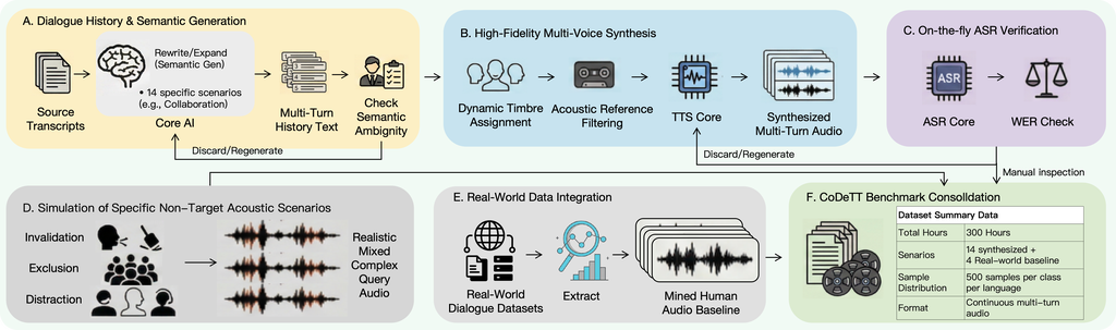 图注:CoDeTT数据集六阶段构建流水线全景图——从文本生成到声学模拟,再到真实数据融合,展示数据工程的完整性和严谨性。