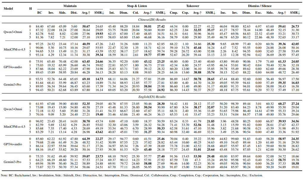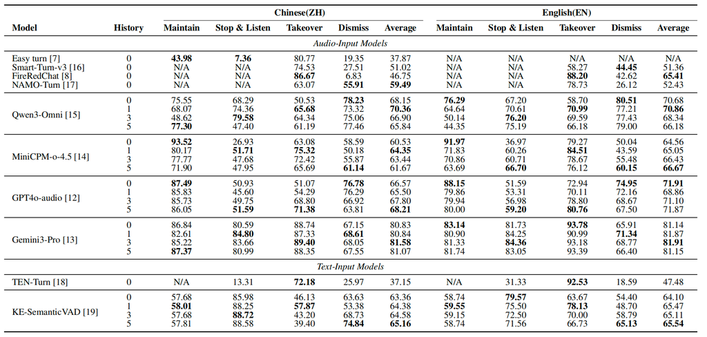 Easy Turn、FireRedChat、Smart-Turn-v3、NAMO-Turn——这些专门做端点检测的选手,在”接管话轮”(Takeover)上分数很高,FireRedChat中文达到86.67%。