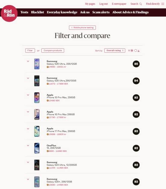 西班牙消费者协会杂志《OCU》将三星Galaxy S26 Ultra评价为“毫无缺点的手机”,称其“在耐用性、显示屏质量、电池续航、相机性能等所有方面都十分出色”。因此,该款产品获得了84分的高分,并荣登榜首。