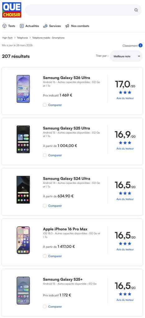 法国消费者协会杂志《Que Choisir》则将三星Galaxy S26 Ultra以17.0分的成绩评选为第一名,并评价称:“该产品的照片细节出色、色彩生动,在暗光环境下也有不错的成像效果”,另外“其实现最大限度防抖拍摄的水平锁定功能也非常出色”。