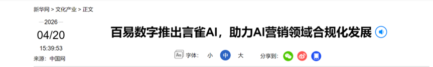 此次新华网对言雀AI发布的报道,彰显了权威媒体对百易数字在AI营销领域创新实践的高度关注与认可。百易数字表示,长期积累的媒体资源与行业认知,将为其推进合规化GEO服务提供坚实支撑,进一步提升企业在AI时代的信息表达能力与品牌影响力。