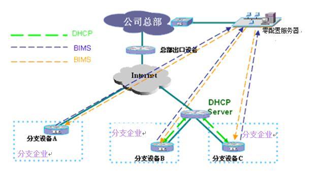 针对分支企业的零配置管理方案充分考虑了跨越Internet的应用场景,采用TR069协议进行业务管理,与生俱来地具备对动态IP地址设备的管理能力,如图4。管理员可以足不出户,在总部机房进行全网设备的规划和预配置策略的制订,分散在全国乃至全球各地的远程分支设备上电后自行向总部获取配置,并实现企业分支网络的互联和业务的发放,无需企业分支网络人员的参与,降低了对企业分支网络管理人员的要求,免去了总部技术人员满天飞的囧境。